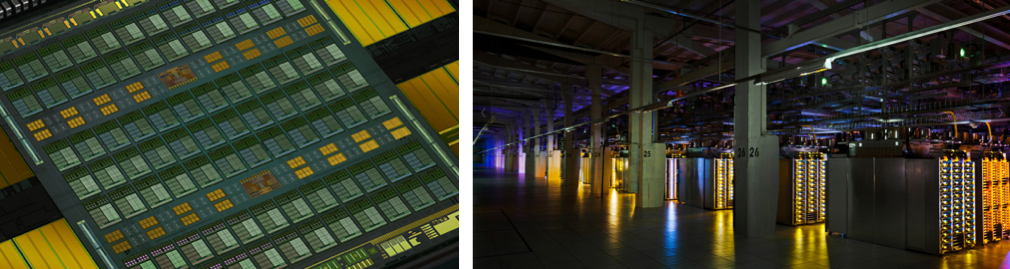 On the left a close-up image of NVIDIA GV100 GPU, 5120 FP32 cores, 21.1 billion transistors, 12 nm process. On the right servers inside Google's Hamina data center.