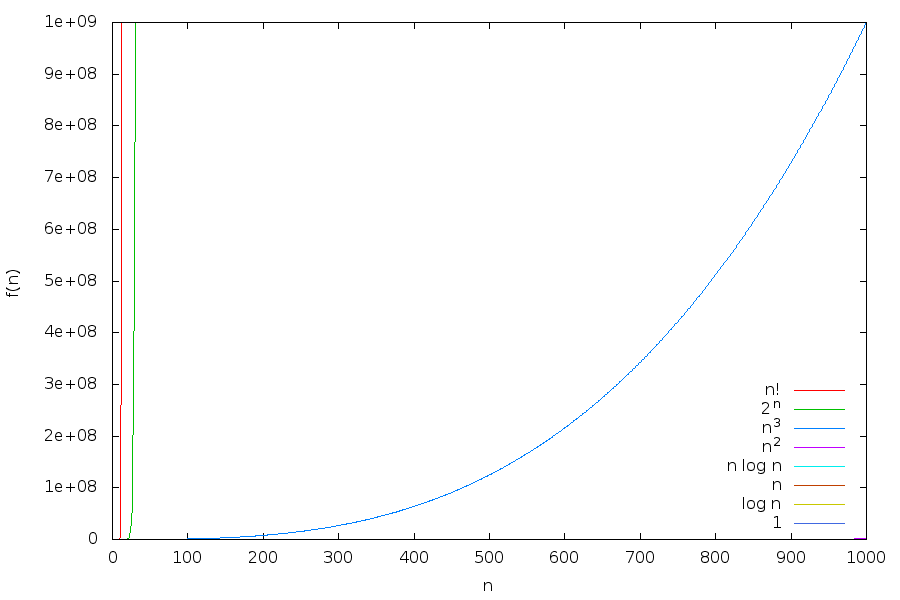 Let us take the functions \(1\), \(\log n\), \(n\), \(n \log n\), \(n^2\), \(n^3\), \(2^n\) and \(n!\). Plotting these functions with a linear \(y\)-axis, we observe: