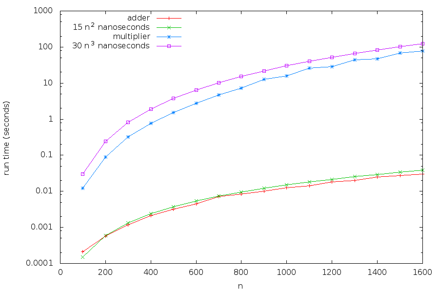 Observe that we have also plotted the function “\(n^3\) nanoseconds”